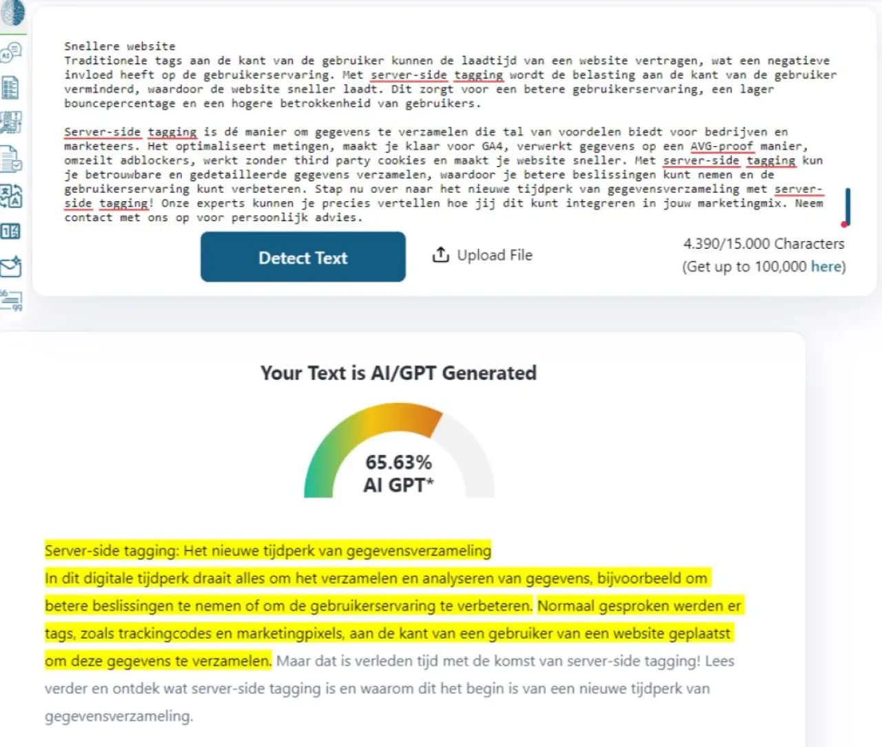 Hier is het resultaat te zien van onze blog over serverside tagging die we in het verleden hebben geschreven. Dit is resultaat van een blog in gptzero.me:
